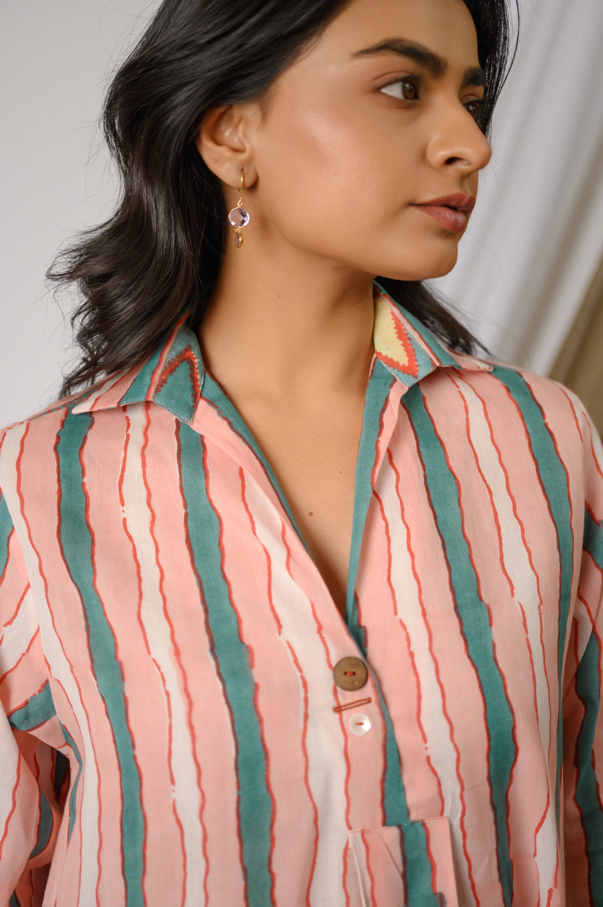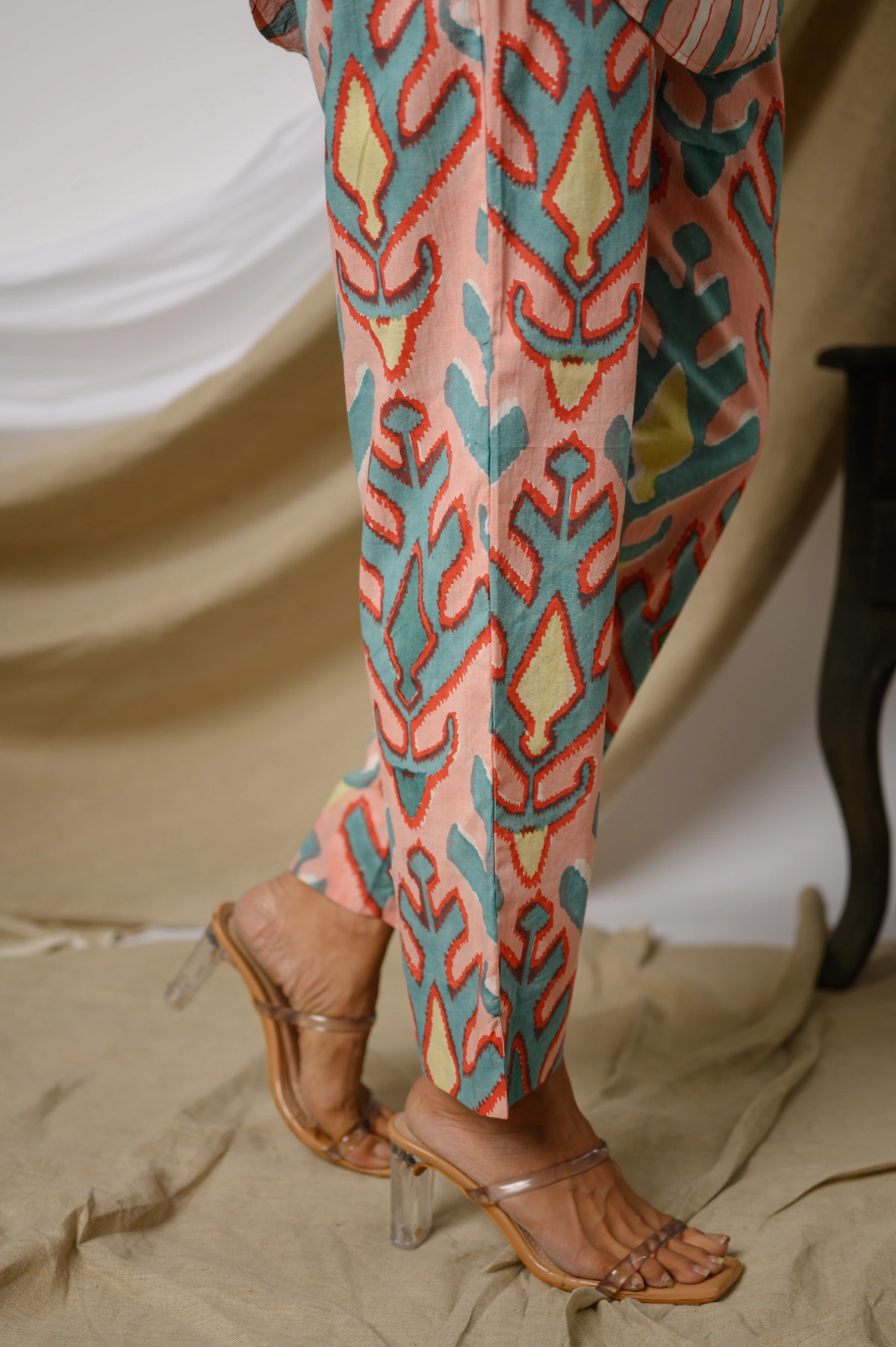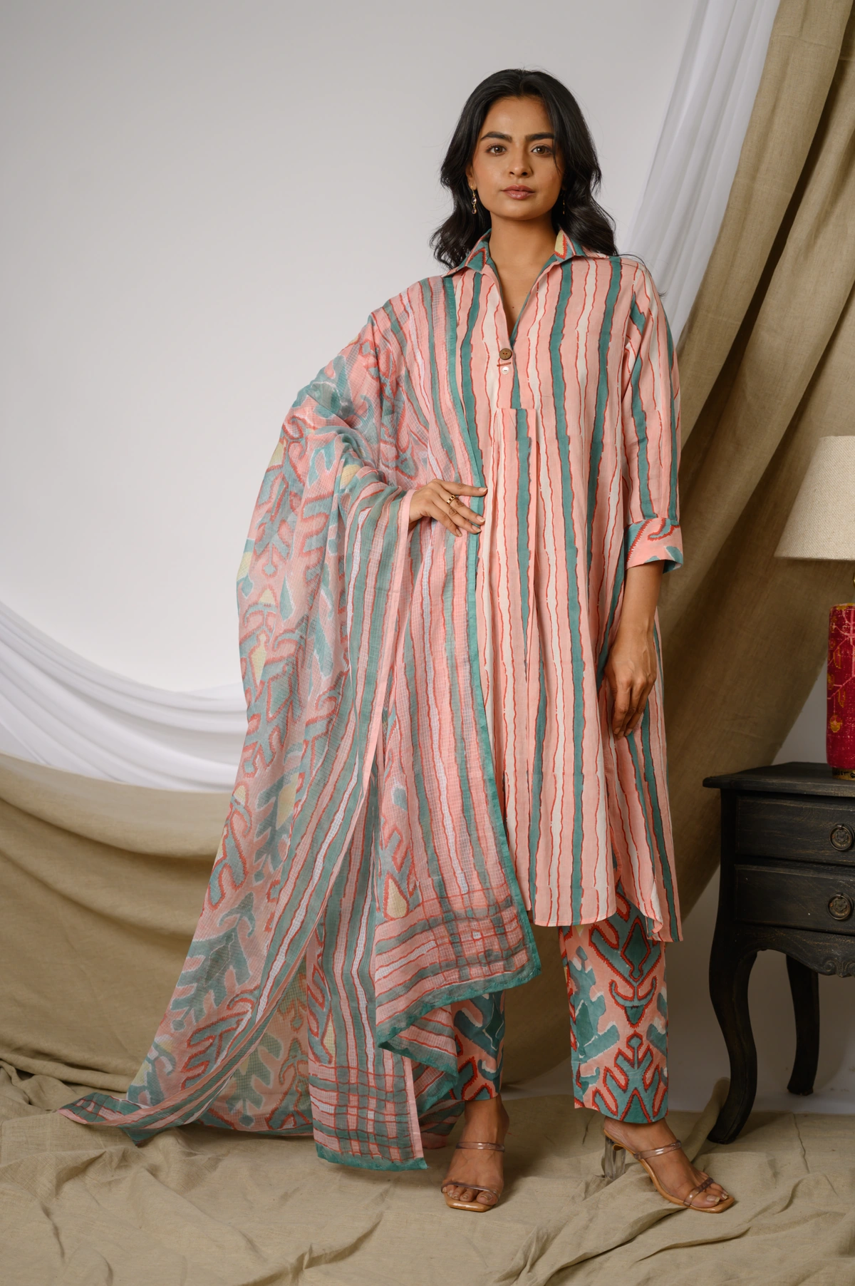Step into effortless elegance with the Olympia Co-ord Set, a beautifully coordinated ensemble crafted in breathable cotton. This stylish set features a collared kurta adorned with a classic stripes print, enhanced by a subtle two-button detail at the neckline for a touch of sophistication. Paired with ikat-printed pants, the contrasting yet complementary handblock prints create a striking visual harmony.