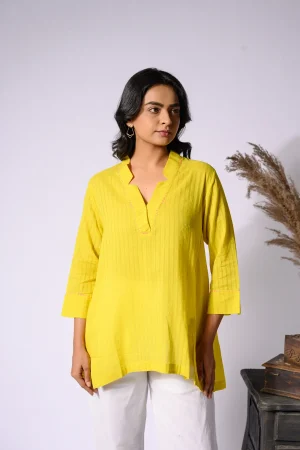 ₹2,000.00* Yellow top with V-neck . * Gudri on collar. * Finished with French seam. * Estimated ship time: 5 - 7 working days. * The garment color may vary slightly due to photographic lighting or the screen settings of your device. * Please check the measurement chart and return policy before placing the order. * Model is wearing size ’S’