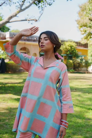₹5,200.00* Cotton mulmul handblock printed kurta with solid colour pants. * Sultani stitchwork on neckline, light gather detail underneath the neckline. * Finished with French seam. * Estimated ship time: 5 - 7 working days. * The garment color may vary slightly due to photographic lighting or the screen settings of your device. * Please check the measurement chart and return policy before placing the order. * Model is wearing size ’xs’